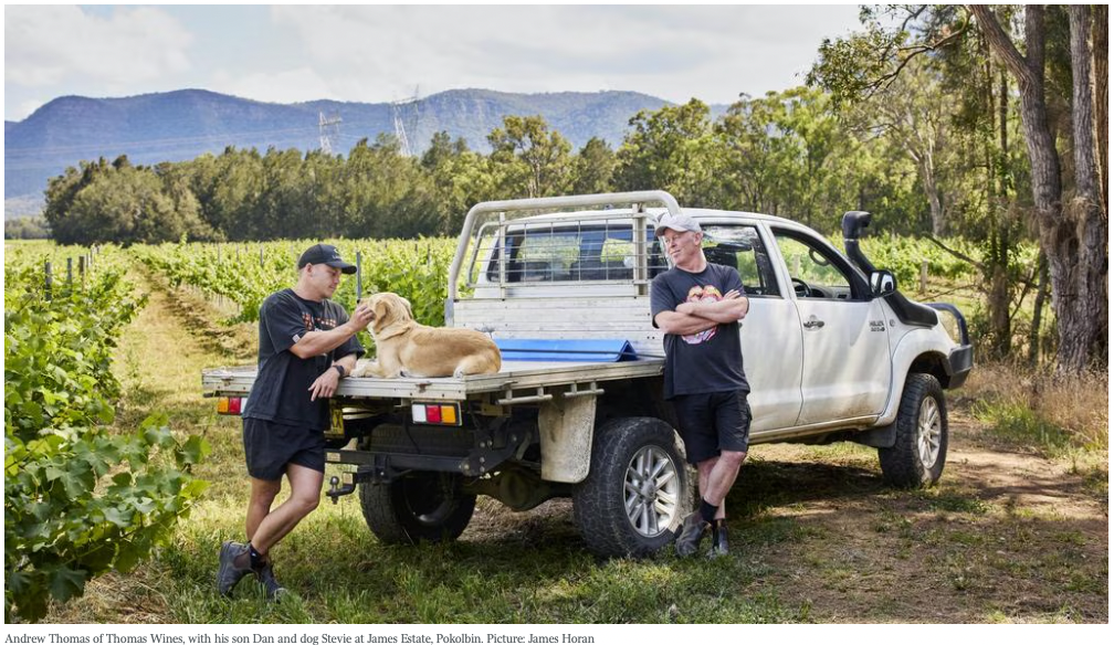 But it could be time to kiss it goodbye. In 2022, Pokolbin Estate was sold to Sydney-based developers DevCore, and work has begun transforming the site into a “luxury ­masterplanned estate”. A road now cuts through the middle of the old-vine shiraz block, with subdivisions plotted on ­either side. Earthworks are underway for drainage channels and other infrastructure. The vineyard is essentially a construction site. “We can’t get in there with a tractor to work the vineyard,” says Thomas, head winemaker at nearby Thomas Wines, a family business he founded in 1997. “There’s not going to be a 2025 vintage. It’s over. Instead, we’re going to end up with ­houses on land where old-vine shiraz used to grow and produce world class wine.”